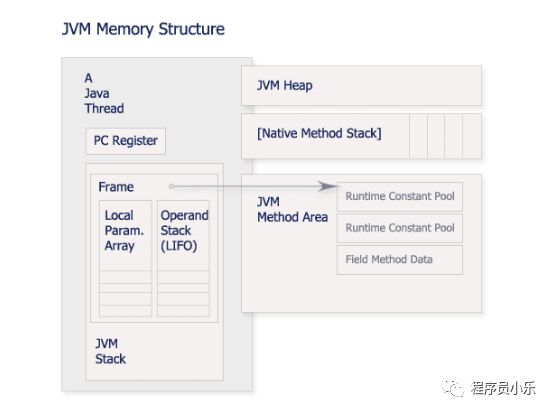 JVM栈是线程私有的,每个线程创建的同时都会创建JVM栈,JVM栈中存放当前线程中局部基本类型的变量(Java中定义的八种基本类型:boolean、char、byte、short、int、long、float、double)、部分的返回结果以及Stack Frame,非基本类型的对象在JVM栈上仅存放一个指向堆的地址。