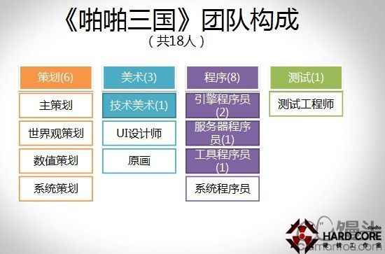 简单介绍一下我的游戏经历,之前做过端游,现在跟两个老家伙一起在做《啪啪三国》。介绍一下我们团队的构成,我们目前为止一共有18个人,其中策划6个,美术3个,程序8个,测试1个。我今天讲技术,可能这些职位是我重点介绍的,一个是引擎程序、服务器程序、和工具程序。我主要以程序为主来讲解。