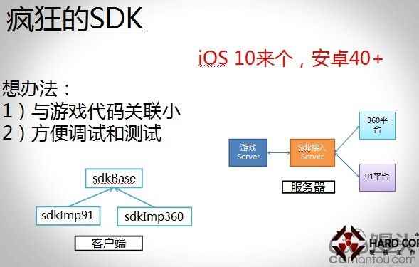但是有两个原则要注意,一个是与游戏代码的关联性小,第二个要方便调试和测试。这样的话,我们接SDK的时候,就用工具,用SDK的程序员就可以了解。同时开发商也可以把SDK交给别人去接,不会产生泄露游戏代码的一个尴尬和担心。事实证明我们安卓渠道的代理商非常给力,我们所有安卓渠道的SDK都是他们帮我们接的。
