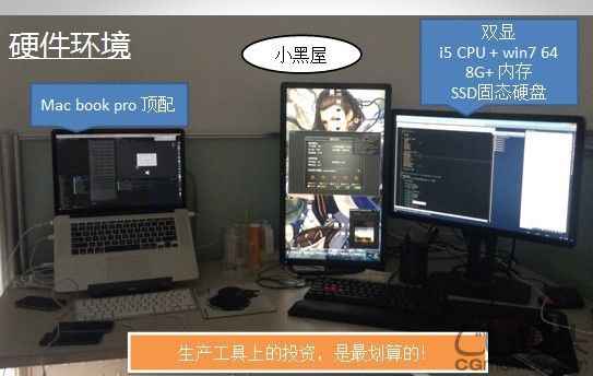 先说一下我们程序的工作环境,首先是小黑屋,程序员工作环境不能太敞亮了。我们在硬件设施上是不计成本的,比如说右边这个高端大气上档次的巨屏双显,i5CPU+Win7 64,8G内存,SSD固态硬盘。为什么要用这么好?很多程序员招聘的时候都会问,你们公司是不是双显啊?从我们关心生产力的角度来讲,这套“神机”可以大大提高Unity3D的开发效率。Unity3D在整个程序员开发的过程当中,它其实很多的工作是需要很多读盘操作的,你有这么一套神机的配置,程序员的工作效率我估计应该会有5—6倍的提高,这个是实话实说。如果你们还像我们一样高端大气的话,你还应该配一个Macbook Pro的匹配。