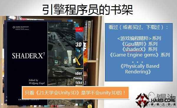 说到Unity3D我这里有一个引擎程序员的说法,他要懂3D引擎。你怎么判断这个引擎程序员合格不合格呢?你问他看什么书?他如果说我在看《21天学会Unity3D》这是无法做引擎程序员的。这是一个引擎程序员的书架,看过哪些书呢?《游戏编程精粹》,《GPU精粹》系列,《ShaderX》系列等,哪怕你出去找工作,你跟老板谈我读过这个,也至少看上去象个样,即使没看过,至少眼界得开阔,Unity3D之所以用不好,因为有这么多书要看。如果说你经常上Unity3D学院的网站,这个是不管用的。所以说只看《21天学会Unity3D》是学不会Unity3D的。
