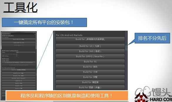 一键搞定所有平台的安装包。因为大家知道你现在渠道接这么多,你出个版本一个键,比如说你有十个渠道,你没有我们那个神机的话,那打包一个渠道就得半小时。这是我们安卓渠道的出包工具,排名不分先后(全场哄笑)。