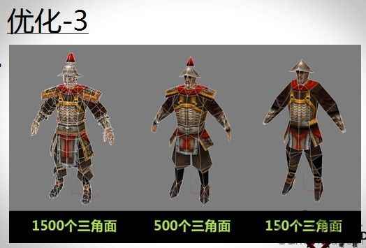 这个从显卡上看是一个人,但是它其实是由三角形组成的。比如说你的人物三角面形特别多?那怎么办?就减。渲染很多兵的时候我们就用右边的这个没腿的,其实做游戏,游戏视觉就是蒙人。