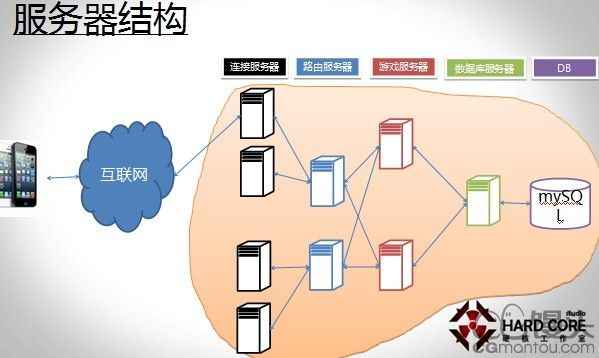这是一个典型的端游结构,前面一个是连接服务器,它的作用就是说我们游戏是一个长连接的游戏,一台物理机承载服务器承载是有限的,我们是要有很多台,然后后面就是路由服务器,还连接了两台和多台的服务器。后面这个红色的是游戏服务器,再后面就是数据库服务器,提供一个高速的缓冲。选择这种服务器结构原因是易于拓展