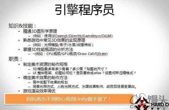 引擎程序员我讲讲核心的要点,他首先是要了解3D引擎工作的原理,优化起来有的放矢,出了问题才知道如何救火。如果你开始没有把握好项目的标准的话,一不小心就跳进大坑。这一块做不好的话最要命的是我,比如人物做了50套,如果一旦不行,你们推倒重来,那你这个美术资源就打水漂了。真正找到靠谱的Unity3D的人,那就是“妈妈再也不用担心我用Unity3D做手游了。”