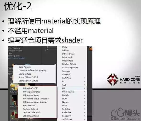 理解所使用Material的实现原理,不滥用Material。前面有人讲过,Unity跟玩游戏一样的,你发现后面跑不动了,就要有一个明白人给你做一个规划,你有没有这样的效果,如果有的话你要怎么实现。我们用什么样的Shader,是不是还有高低配。给大家看一下,左边这个小菜单是我们自己写的部分材质的效果,上面也是包括人物和效果。