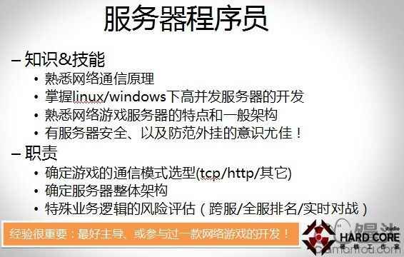它的知识技能和职责,我就不仔细说了,说细了有一点像招聘启示。他的主要职责虽然负责技术,但是也给产品决策和方向提供一些决策。他最主要的考核指标,就是经验很重要,最好主导或参与过一款网络游戏的开发。举个例子比如说两个程序员,一个是刚毕业于西太平洋大学,主攻方向是复杂电子稳定器。另外一个人可能在煤老板手下开发过一款游戏,虽然容量不大但游戏可以承担3000人,我肯定是选跟煤老板干过的人,这是我对服务器程序员的认识。