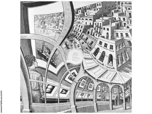 青年想了想,参照埃舍尔的风格画了一幅画。