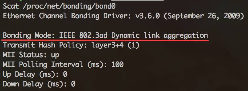 当主机有1个以上的网卡时,Linux会将多个网卡绑定为一个虚拟的bonded网络接口,对TCP/IP而言只存在一个bonded网卡。多网卡绑定一方面能够提高网络吞吐量,另一方面也可以增强网络高可用。Linux支持7种Bonding模式:详细的说明参考内核文档LinuxEthernet Bonding Driver HOWTO。我们可以通过cat/proc/net/bonding/bond0查看本机的Bonding模式: