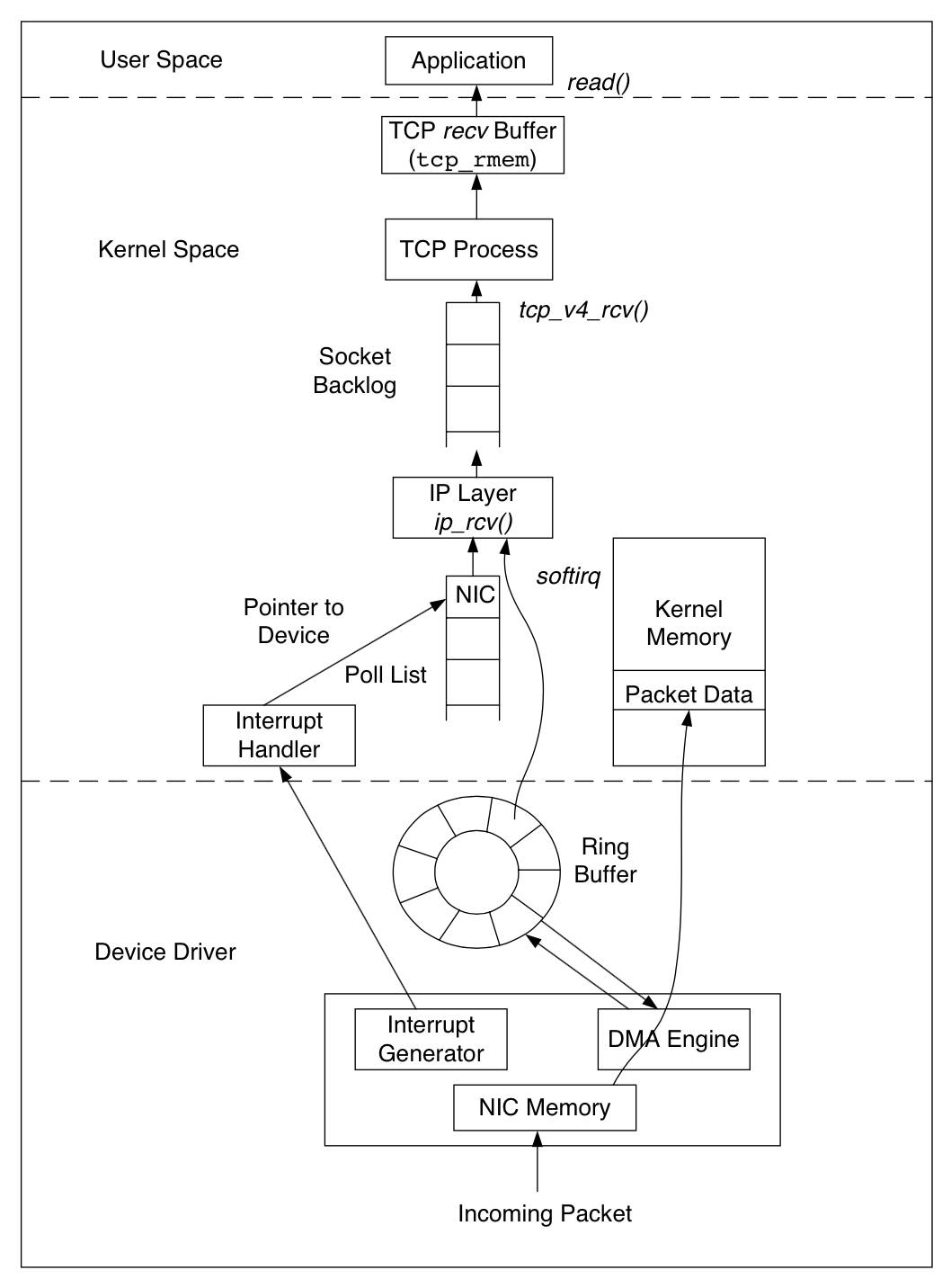 数据包的接收,从下往上经过了三层:网卡驱动、系统内核空间,最后到用户态空间的应用。Linux内核使用sk_buff(socketkernel buffers)数据结构描述一个数据包。当一个新的数据包到达,NIC(networkinterface controller)调用DMAengine,通过RingBuffer将数据包放置到内核内存区。RingBuffer的大小固定,它不包含实际的数据包,而是包含了指向sk_buff的描述符。当RingBuffer满的时候,新来的数据包将给丢弃。一旦数据包被成功接收,NIC发起中断,由内核的中断处理程序将数据包传递给IP层。经过IP层的处理,数据包被放入队列等待TCP层处理。每个数据包经过TCP层一系列复杂的步骤,更新TCP状态机,最终到达recvBuffer,等待被应用接收处理。有一点需要注意,数据包到达recvBuffer,TCP就会回ACK确认,既TCP的ACK表示数据包已经被操作系统内核收到,但并不确保应用层一定收到数据(例如这个时候系统crash),因此一般建议应用协议层也要设计自己的确认机制。