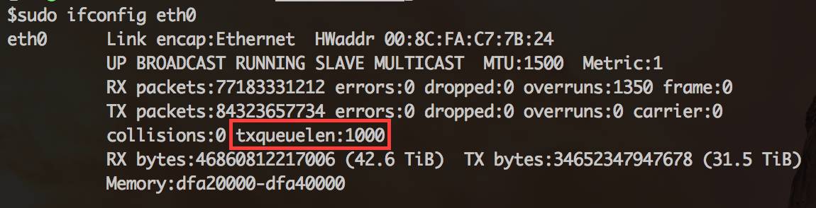 使用ifconfig调整txqueuelen的大小:ifconfig eth0 txqueuelen 2000