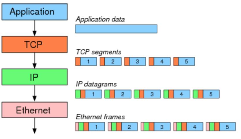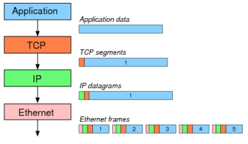 一般以太网的MTU(MaximumTransmission Unit)为1500 bytes,假设应用要发送数据包的大小为7300bytes,MTU1500字节- IP头部20字节 -TCP头部20字节=有效负载为1460字节,因此7300字节需要拆分成5个segment: