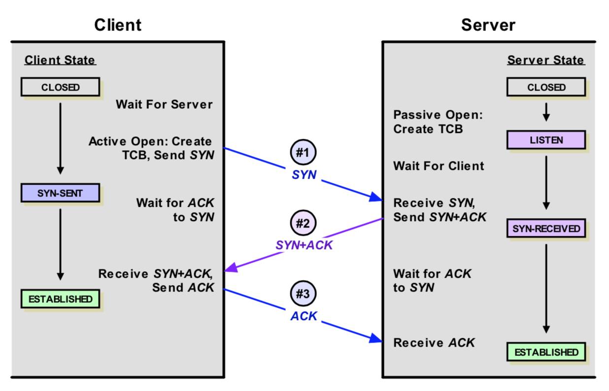 简单看下连接的建立过程,客户端向server发送SYN包,server回复SYN+ACK,同时将这个处于SYN_RECV状态的连接保存到半连接队列。客户端返回ACK包完成三次握手,server将ESTABLISHED状态的连接移入accept队列,等待应用调用accept()。