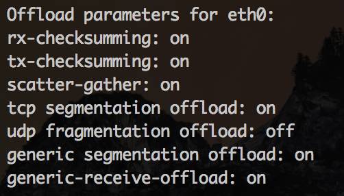 可以使用ethtool-k eth0查看网卡当前的offloading情况: