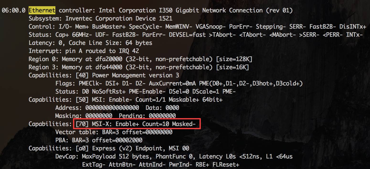 首先查看网卡是否支持多队列,使用lspci-vvv命令,找到Ethernetcontroller项: