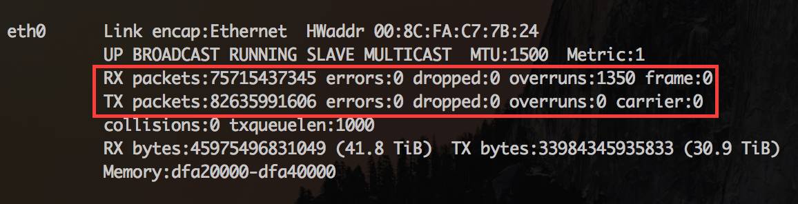 上面的例子接收队列为4096,传输队列为256。可以通过ifconfig观察接收和传输队列的运行状况: -