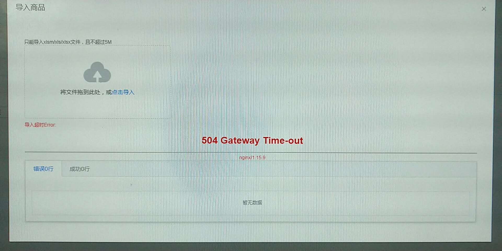 某应用的后台,通过后面界面上传一个excel文件时,上传到半截是,后面界面显示 504 gateway time-out错误。
