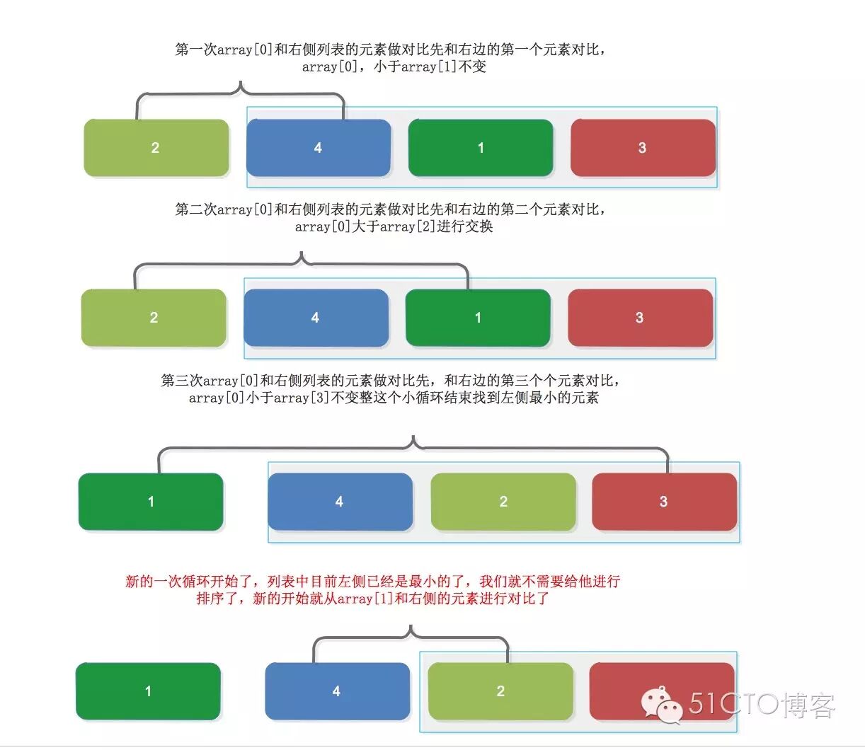 第1次,从列表最左边开始元素为array[0],往右循环,从右边元素中找到小于array[0]的元素进行交换,直到右边循环完之后。