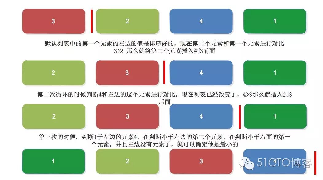 一个列表默认分为左侧为排序好的,我们拿第一个元素举例,他左边的全是排序好的,他右侧是没有排序好的,如果右侧的元素小于左侧排序好的列表的元素就把他插入到合适的位置