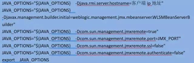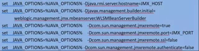 注意JMX_HOST为weblogic的主机名或IP地址,JMX_PORT为JMX端口,通常使用12345,然后重启weblogic,JMX就开启了。