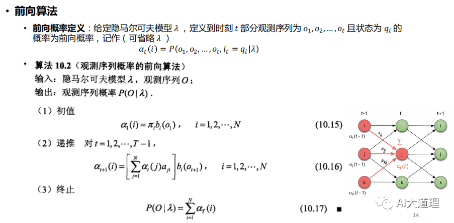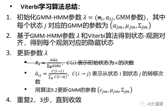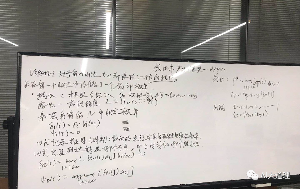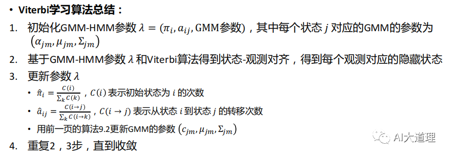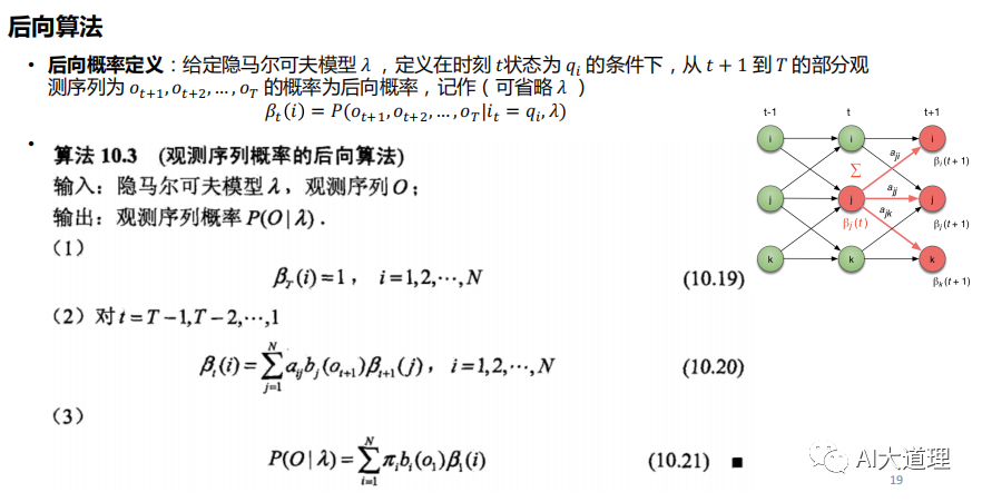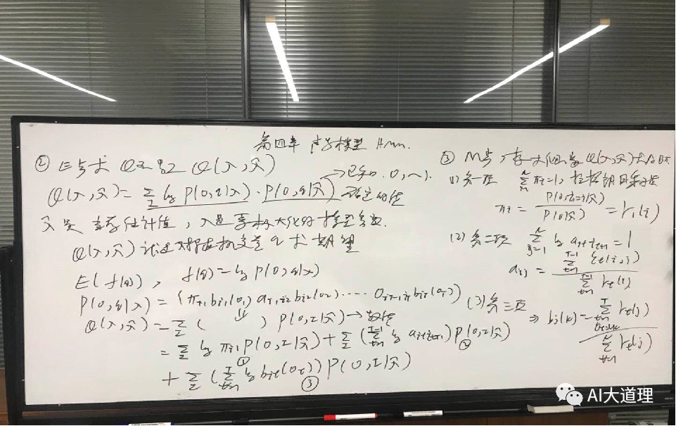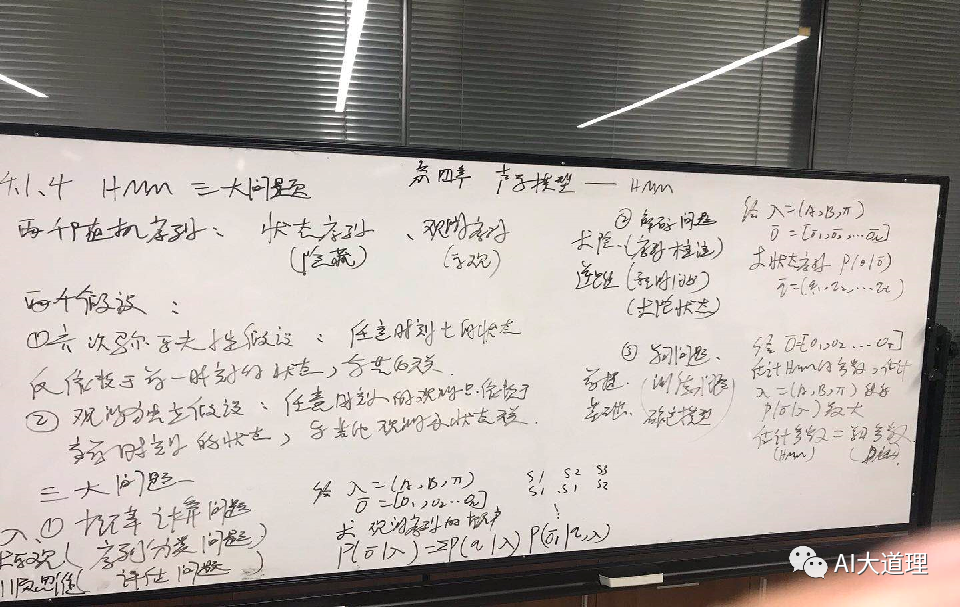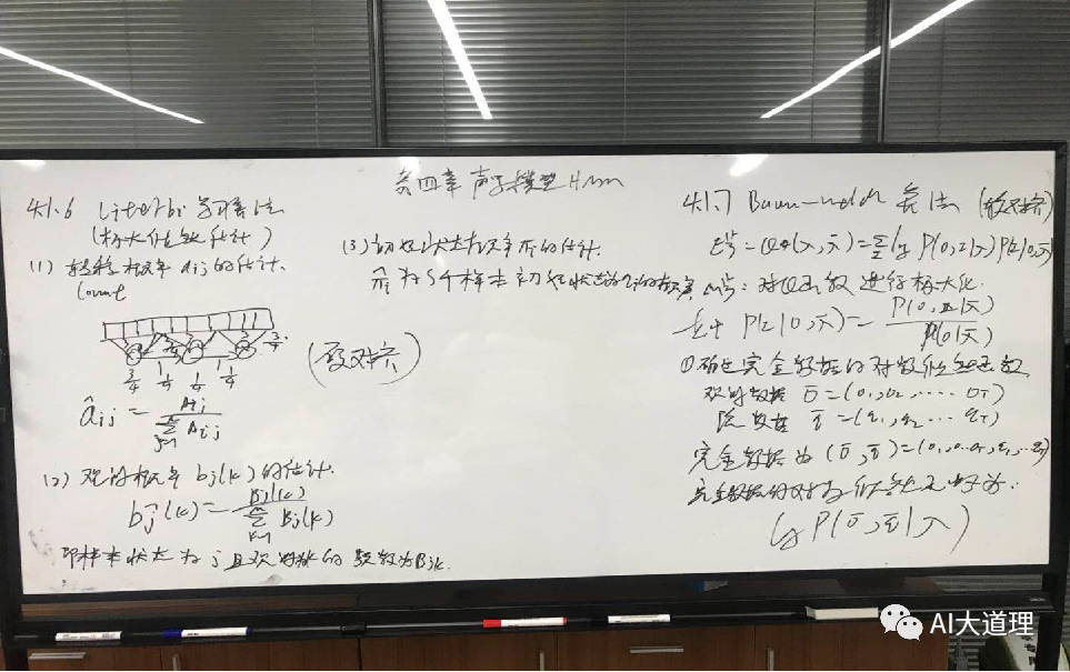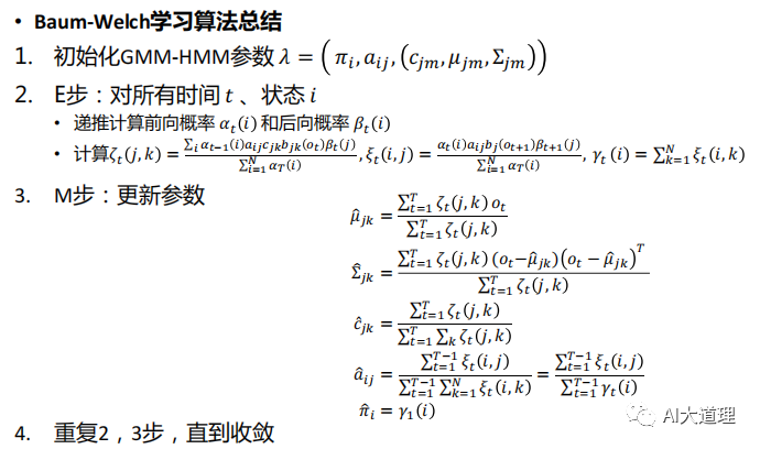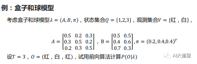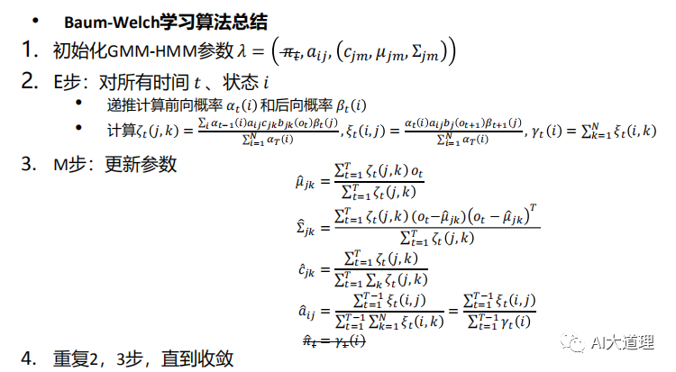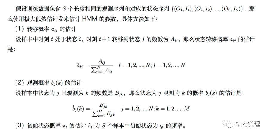 3)模学习问题。即给定观测序列O={o1,o2,...oT},估计模型λ=(A,B,Π)的参数,使该模型下观测序列的条件概率P(O|λ)最大。这个问题的求解需要用到基于EM算法的Baum-Welch算法。