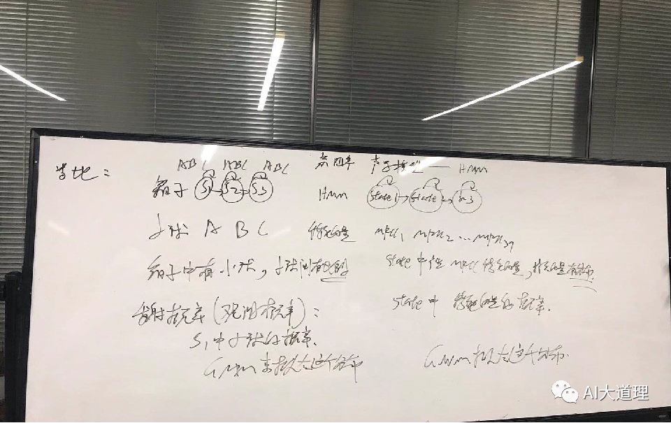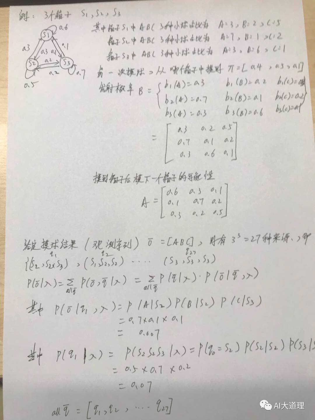 类比箱子和小球,手从哪个箱子拿的球不知道,只知道拿出来后看见的小球,问小球来自哪个箱子的可能。其中,箱子就是隐状态,小球就是可观测的。箱子中有不同小球的比例,或者分布,而HMM中也有隐状态对应到特征向量的概率分布。假如箱子中小球分布符合高斯分布,假设HMM中隐状态中特征符合高斯分布,GMM混合高斯模型就是在模拟这个分布,理解性的表达可以说模拟隐状态中可观测特征的比例。只不过一个箱子中三个小球比列为3:2:1,而HMM一个隐状态中有39种特征,也是有占比。