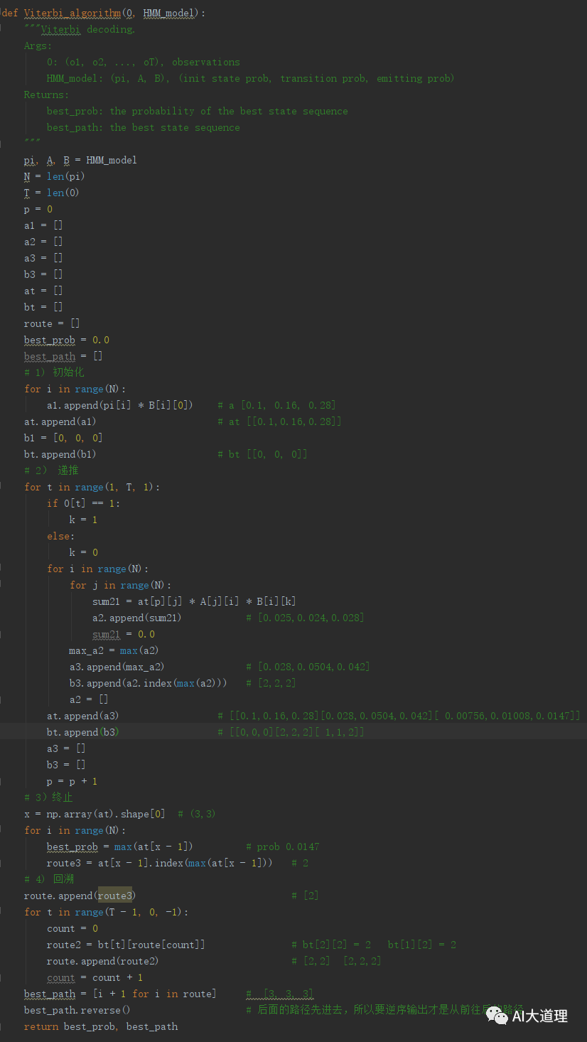 注意:Viterbi算法前向时只是计算概率,并记住,后向回溯时才得到最优路径。