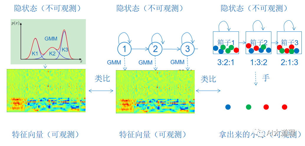 GMM中也有隐状态,特征向量不知道来自哪个Gaussion。K1、K2、K3组成一个GMM,K1、K2、K3类比箱子1、箱子2、箱子3,类比HMM中状态1、状态2、状态3。