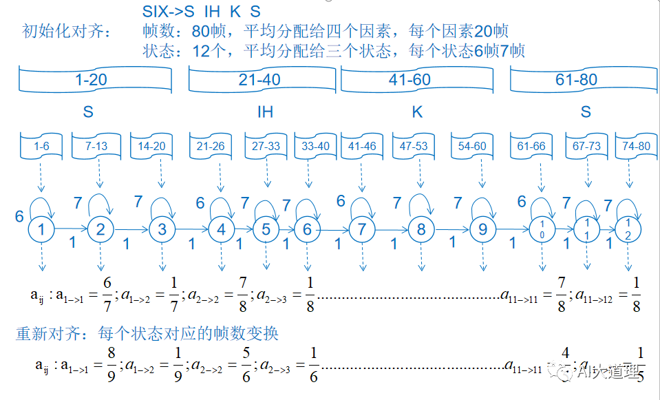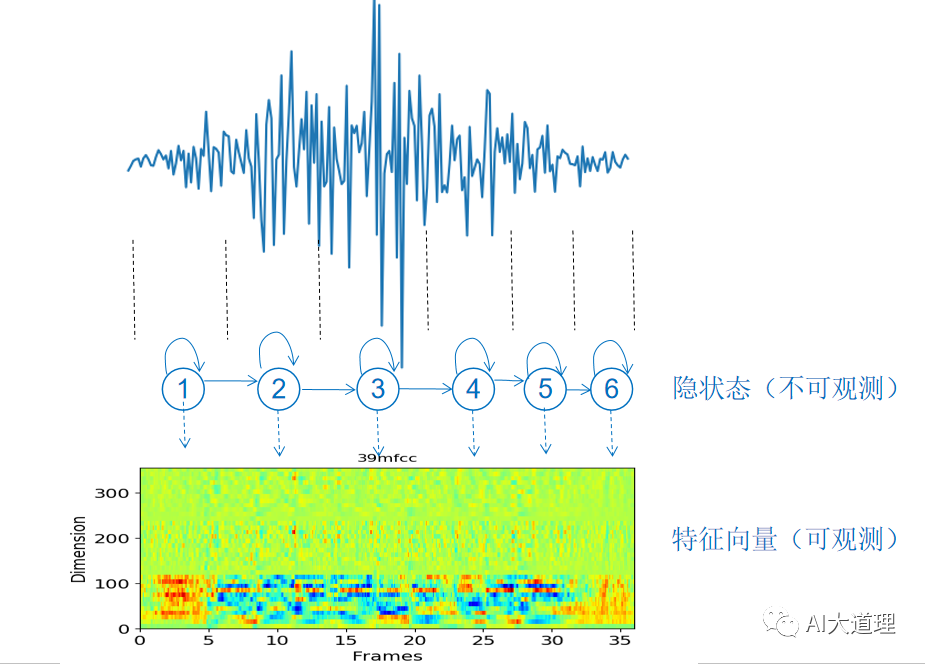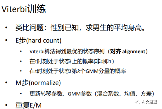 隐藏状态是抽象出来的概念,由于语音信号在一个长时间断内是非平稳信号,而在一个较短的时间内则可近似看做平稳的(比如50毫秒)。平稳信号的特点在于信号的频谱分布是稳定的,不同时间段的频谱分布相似。隐马尔可夫模型将一小段频谱相似的连续信号归为一个隐状态。Viterbi算法对齐就是为了找到哪些帧归于哪个隐状态,隐马尔可夫模型的训练过程是最大化似然度,每一个状态产生的数据用一个概率分布表示。只有当相似的连续信号尽可能被归为同一个状态,似然度才能尽可能的大