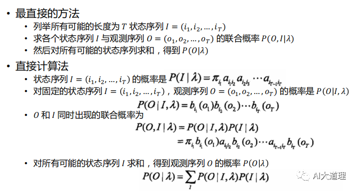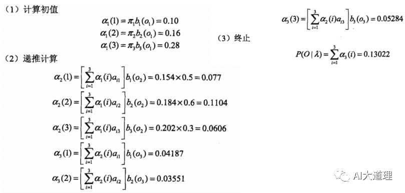 1) 概率计算问题。即给定模型λ=(A,B,Π)λ=(A,B,Π)和观测序列O={o1,o2,...oT}O={o1,o2,...oT},计算在模型λ下观测序列O出现的概率P(O|λ)。这个问题的求解需要用到前向算法、后向算法和直接计算法。