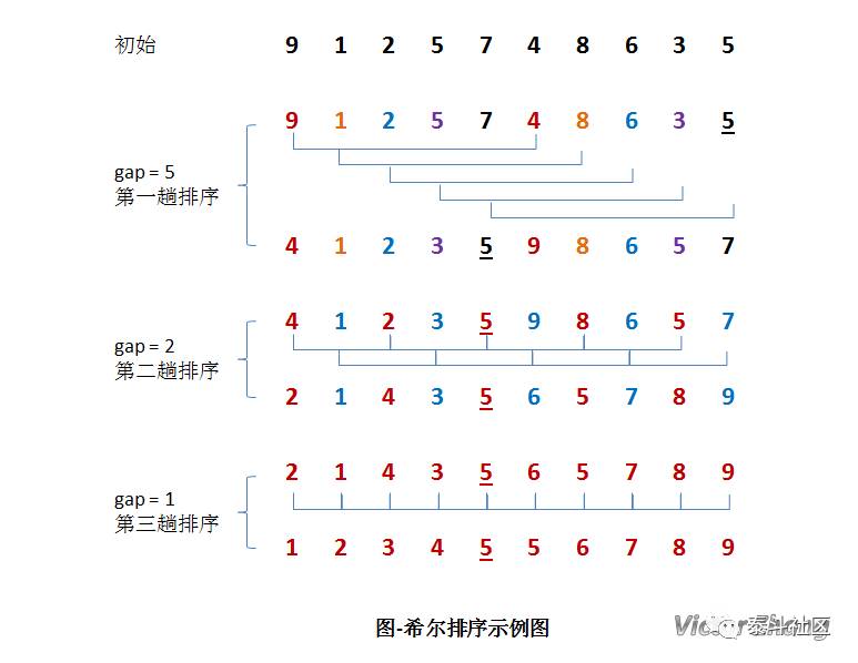 #希尔排序 def insert_shell(L): #初始化gap值,此处利用序列长度的一般为其赋值 gap = (int)(len(L)/2) #第一层循环:依次改变gap值对列表进行分组 while (gap >= 1): #下面:利用直接插入排序的思想对分组数据进行排序 #range(gap,len(L)):从gap开始 for x in range(gap,len(L)): #range(x-gap,-1,-gap):从x-gap开始与选定元素开始倒序比较,每个比较元素之间间隔gap for i in range(x-gap,-1,-gap): #如果该组当中两个元素满足交换条件,则进行交换 if L > L[i+gap]: temp = L[i+gap] L[i+gap] = L L =temp #while循环条件折半 gap = (int)(gap/2)