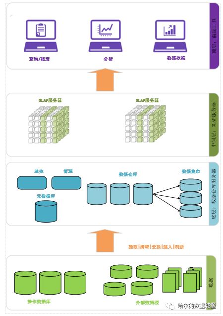 3、顶层是前端客户层,也叫应用层。包括查询和报告工具,分析工具和数据挖掘工具。
