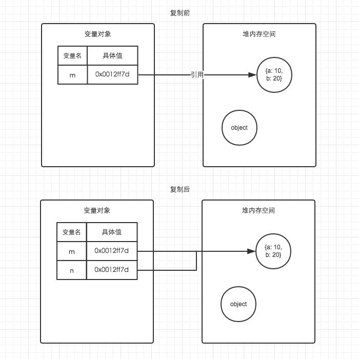 var b = { m: 20 }; // 变量b存在于变量对象中,{m: 20} 作为对象存在于堆内存中