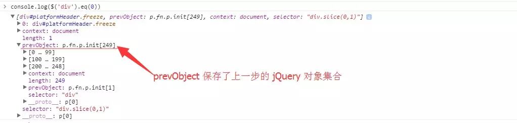 当选择了 (‘div’).eq(0) 之后使用 end() 可以回溯到上一步选中的 jQuery 对象 $(‘div’),其内部实现其实是依靠添加了 prevObject 这个属性: