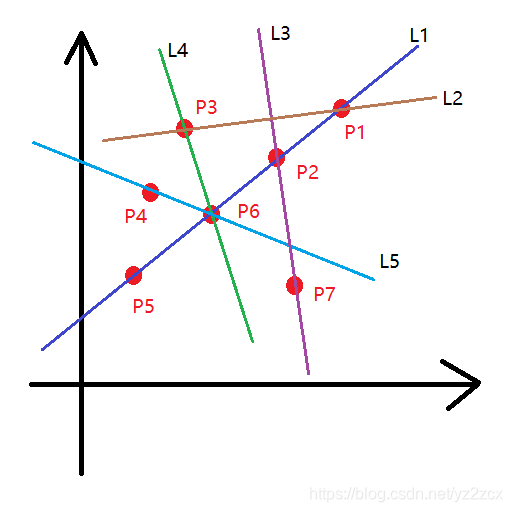 这里,我们知道平面中一条直线会经过无数个离散点,而经过某个点的直线会有N多条: