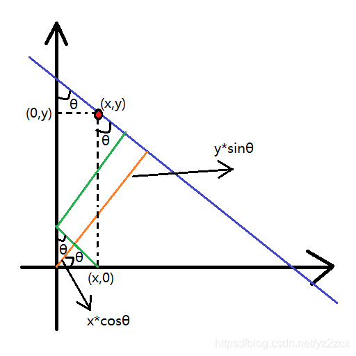 我们知道,斜截式可以表示绝大部分的直线,但是有一种情况是斜截式表示不了的,就是直线垂直x轴的情况,此时斜率为无穷,好像用斜截式表示不了吧。所以就想到用极坐标的形式来表示,但是实际上应该不能算是极坐标吧,因为依然还是笛卡尔坐标,只不过用了角度和距离来表示罢了,看起来有点类似极坐标的表示罢了(挺多博客都直接说是极坐标表示,我觉得应该不准确吧)。这里还是先上图再推出公式的表达: