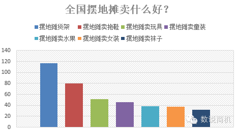 如上图,小数分析了最近一周的监测数据发现,“摆地摊货架、摆地摊卖拖鞋、摆地摊卖玩具、摆地摊卖童装、摆地摊卖水果、摆地摊卖女装、摆地摊卖袜子”是今年(2014年)入夏以来的热点。