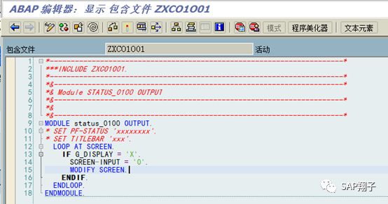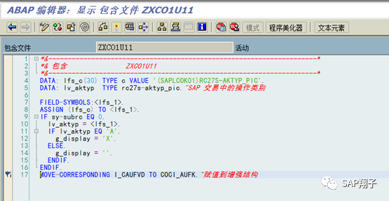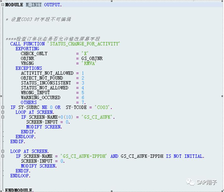 2、增强主要代码在两个EXIT:EXIT_SAPLCOKO1_001/EXIT_SAPLCOKO1_002,屏幕100的PBO: M_INIT