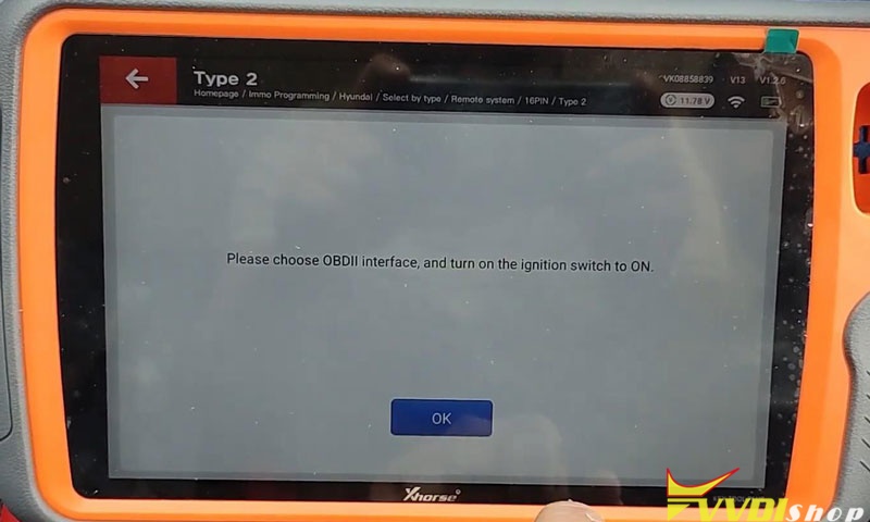 Choose OBD2 interface, and turn on the ignition switch to ON. Press “OK”.