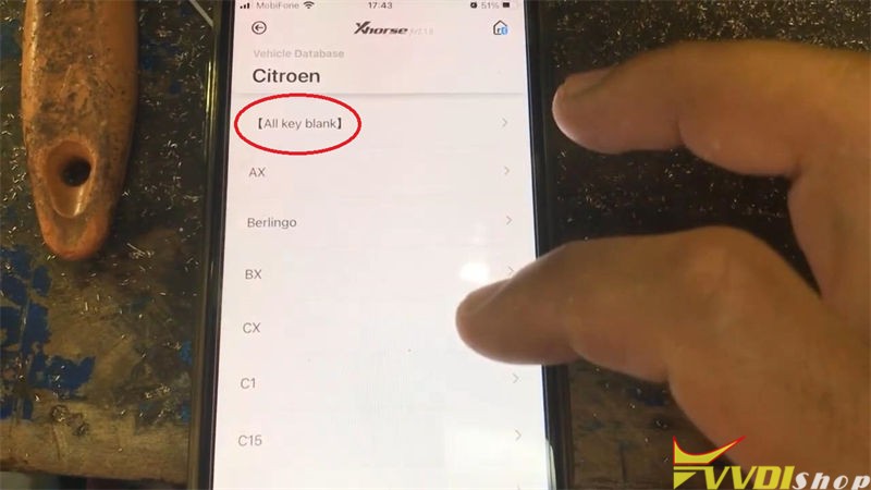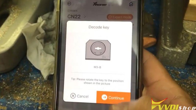 Vehicle database >> Citroen >> All key blank >> CN22, 5 bitting, 830*370 >> OK >> Decode key >> Continue