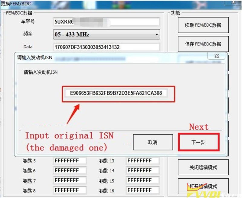 Change FEM/BDC ISN >> Yes >> Has a working key or not? No(select according to situation) >> Input the original vehicle ISN(the damaged one, no secondhand FEM/BDC ISN) >> Next >> Write FEM/BDC data