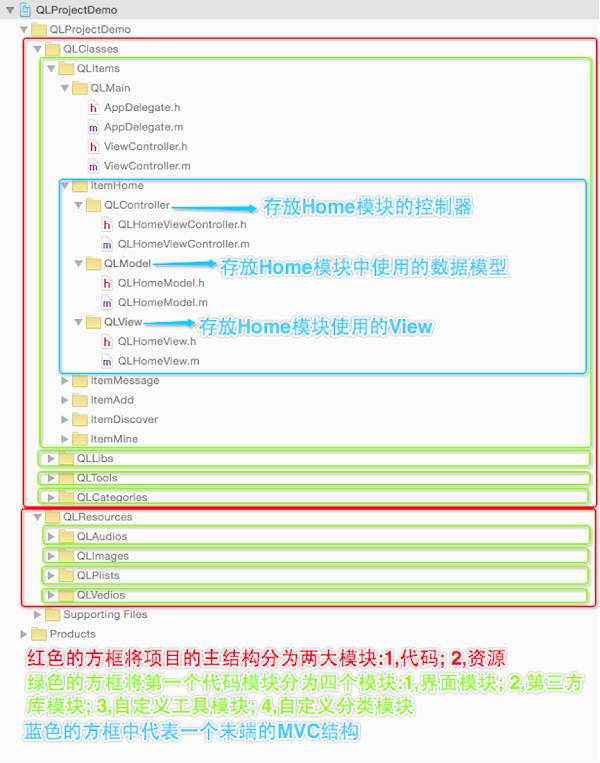 6、 其中文件夹`QLClasses`中是该项目中的所有源代码,`QLResources`中存放的是所有的非代码资源文件,下面就这两个文件夹的结构就新浪微博目前的结构进行详细的说明。整体的框架图如下(这才是重点):