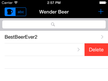 这个应用由一个带导航栏按钮的基本的导航控制器、列表、搜索框和一个控制排序的种类的分段控制器构成。点击“+”按钮显示一个添加beer信息的页面,但是目前这个程序并不能保存添加的数据。