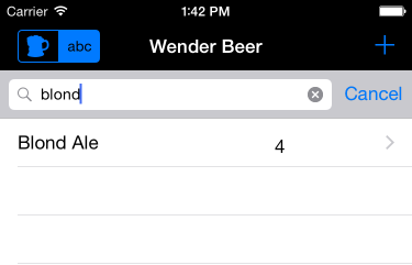 现在在应用中有多款beer出现,我们测试一下应用的搜索功能。我们起始的应用实际上已经包含了搜索框。将列表滑动到最上方就可以看到。当然我们还需要添加一些代码才能实现搜索功能。