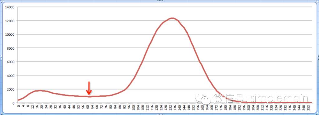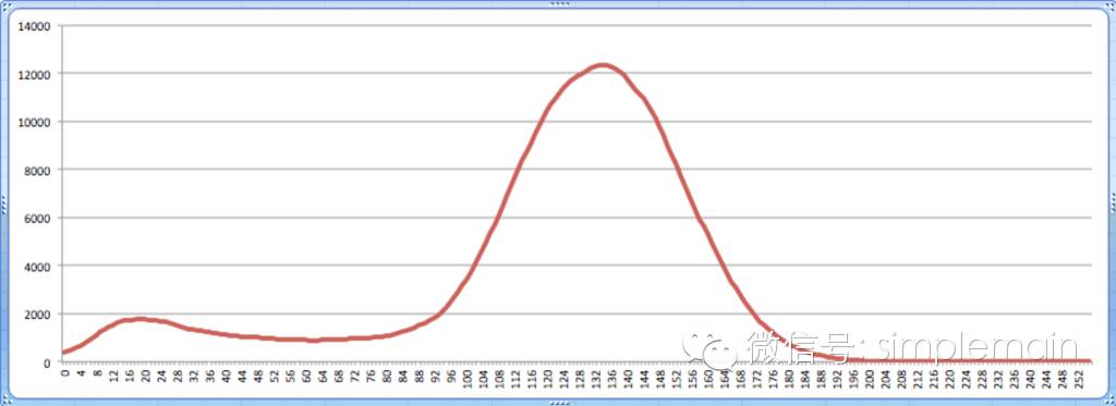 用上述的方法,我把之前处理的那个灰度图片的灰度值放到二维平面上,x轴表示0~255种色值,y轴表示每个色值的个数。仔细看,是否很容易看出有两个波峰。这两个波峰,就是这张灰度图片上最重要的两个色值:前景色+背景色。