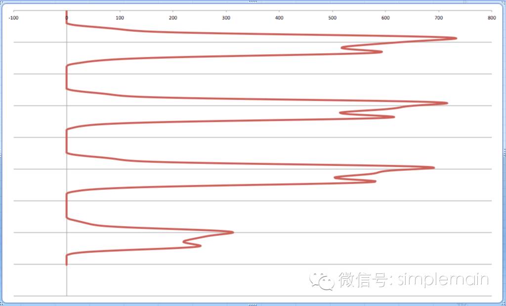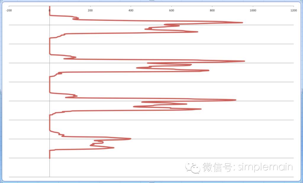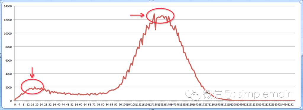 我们用程序怎么判断一个点是波峰呢?就是他旁边的两个点值比他小,对不对。那旁边的两个点比他小,他就一定是波峰嘛?很明显不是。比如我们上面的统计图,很多毛刺的点,他们不是波峰,但是比周围的点要大。那有没有一种比较好的算法能快速的找到波峰呢?