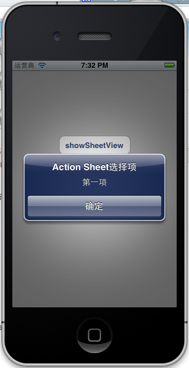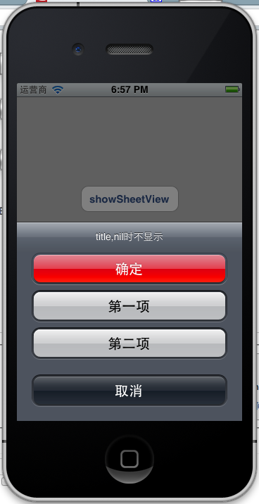 1 - (IBAction)showSheet:(id)sender { 2 UIActionSheet *actionSheet = [[UIActionSheet alloc] 3 initWithTitle:@"title,nil时不显示" 4 delegate:self 5 cancelButtonTitle:@"取消" 6 destructiveButtonTitle:@"确定" 7 otherButtonTitles:@"第一项", @"第二项",nil]; 8 actionSheet.actionSheetStyle = UIActionSheetStyleBlackOpaque; 9 [actionSheet showInView:self.view]; 10 } 11 actionSheet.actionSheetStyle = UIActionSheetStyleBlackOpaque;//设置样式