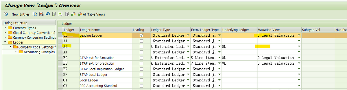 The extension ledger A2 has valuation view , but the underlying ledger 0L has another valuation view 0 assigned.