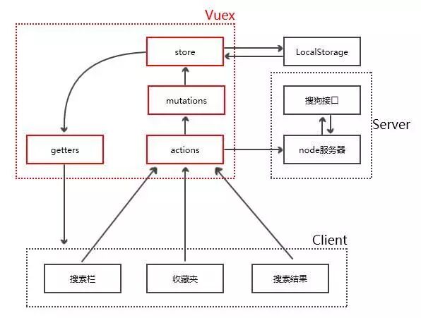 理解完最重要的vuex以后,其他部分也就顺利成章了。箭头表示数据的流动,LocalStorage负责储存收藏夹的内容,方便下一次打开应用的时候内容不会丢失,node服务器负责根据关键字爬取搜狗API提供的数据。