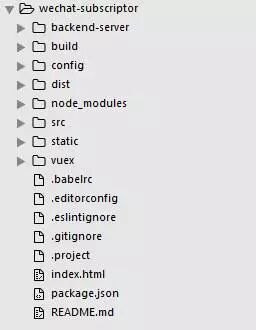 npm install vue-cli -g安装最新版的vue-cli,然后vue init webpack wechat-subscriptor,按提示经过一步步设置并安装完依赖包以后,进入项目的目录并稍作改动,最终目录结构如下: